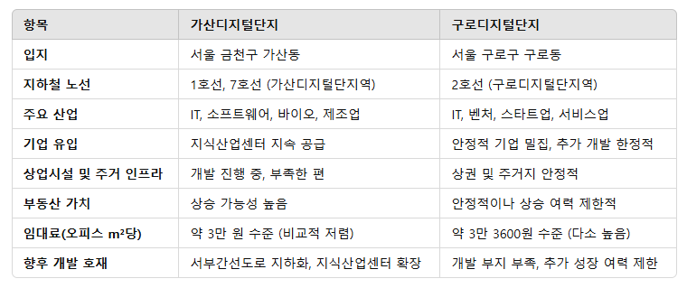 ➡ 가산디지털단지가 미래 가치 상승 측면에서 더 유망합니다. 지속적인 개발과 기업 유입이 활발하며, 교통 인프라 확충으로 부동산 가격 상승 가능성이 높습니다.