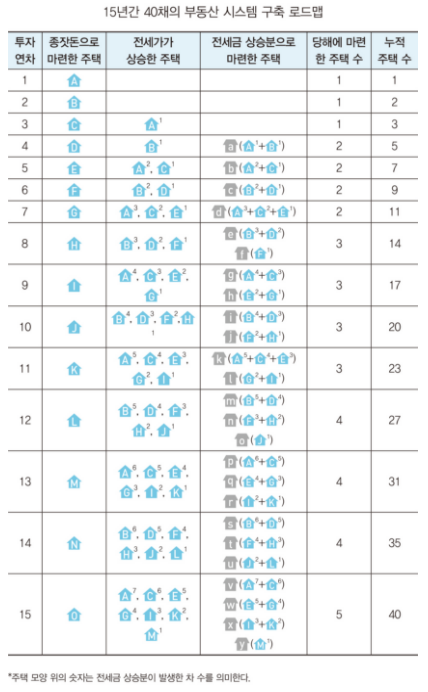 - 갭투자 이용해 15년이 지나 은퇴할 시점에 되면 총 40채의 주택을 소유 가능