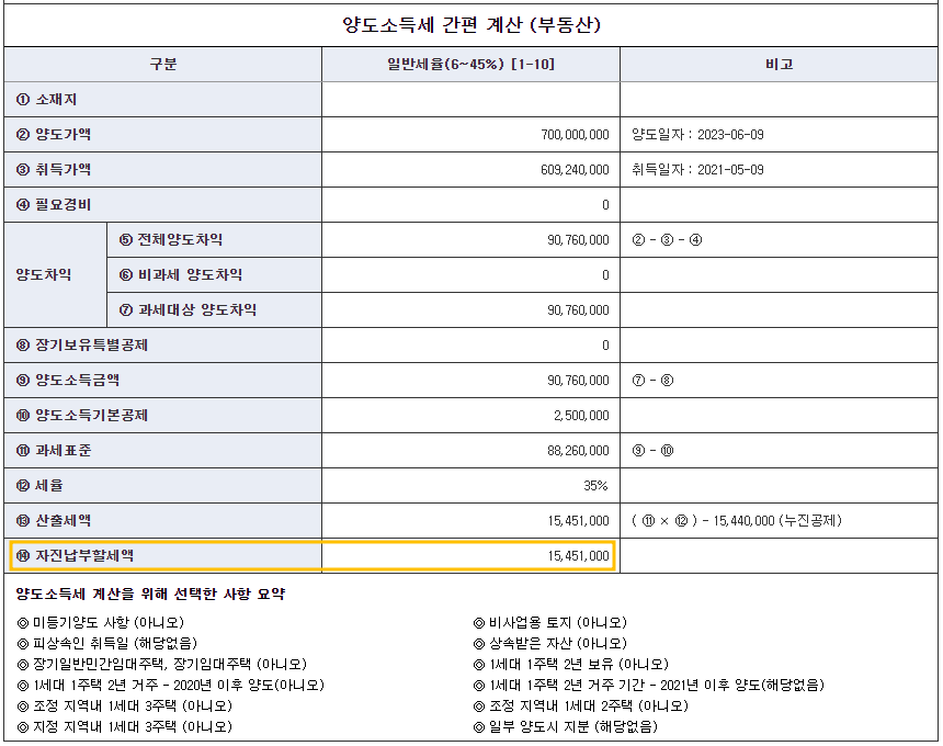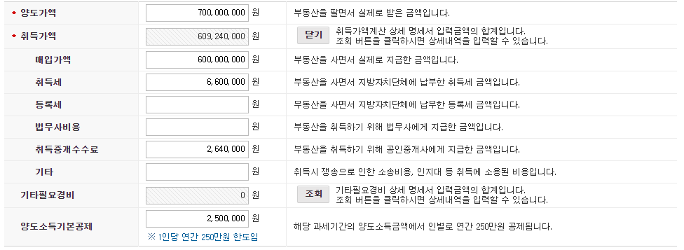 - 6억에 매수하여 취득세, 부동산 수수료, 법무사 비용 등 부대비용 약 1,000만원 소요된다고 가정하고, 2년 후 7억에 매도시