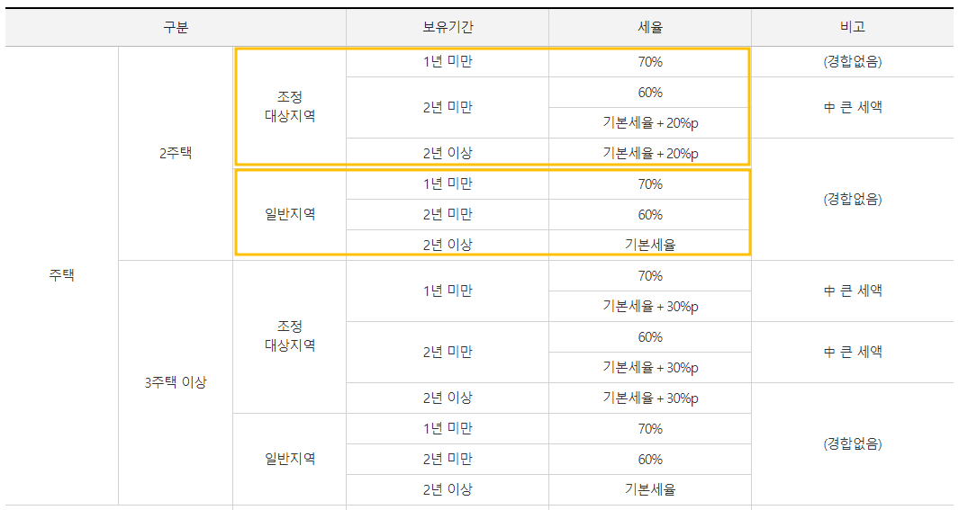 - 2주택자가 일반지역에서 2년 이상 보유시 기본세율이 적용됨