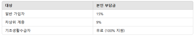 - 등급별 본인 부담금 15~20% (기초수급자는 무료)