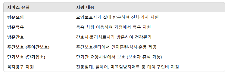 국민건강보험공단에서 운영하며, **장기요양 등급(1~5등급, 인지지원등급)**을 받은 사람은 다양한 혜택을 받을 수 있습니다.