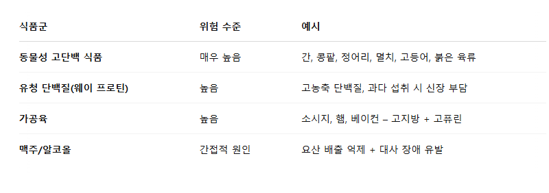 특히 육류, 내장, 어패류, 유청 단백질 과다 섭취 시 요산 농도가 급격히 상승할 수 있습니다.