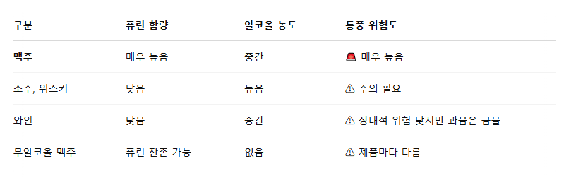 ✔ 퓨린 + 알코올이 과도하게 축적되며 통풍 유발 가능성 급증