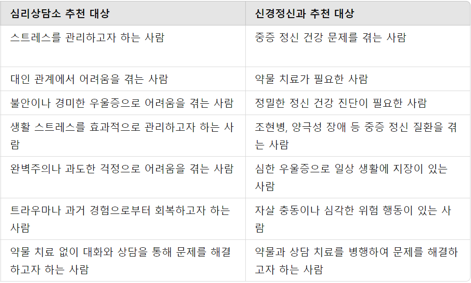 심리상담소와 신경정신과는 각기 다른 접근 방식으로 정신 건강을 다룹니다. 경증 및 중등도 문제를 다룰 때는 심리상담소가 적합하며, 중증의 정신 질환이나 약물 치료가 필요한 경우에는 신경정신과를 이용하는 것이 좋습니다.