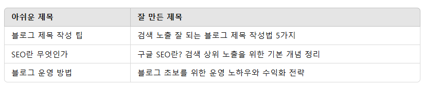 • “블로그 제목 작성법” → “검색에 잘 걸리는 블로그 제목 작성법 5가지”