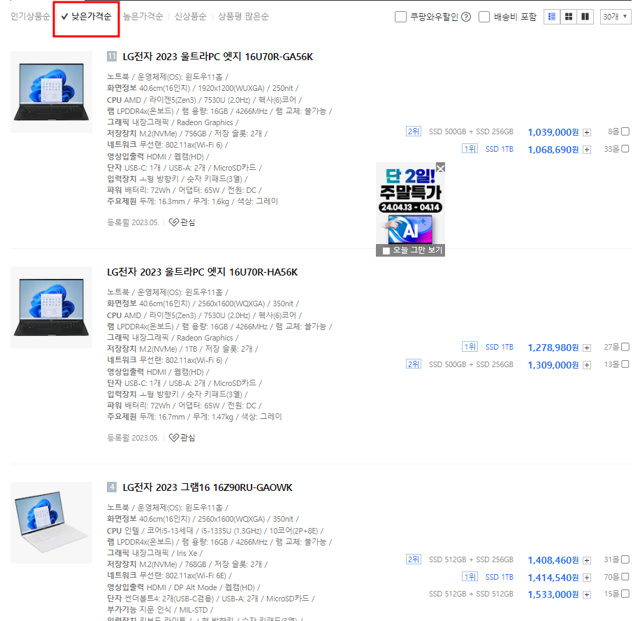 ■ 저가순으로 제품보기를 설정하고 자신에게 맞는 제품을 고르면 된다.