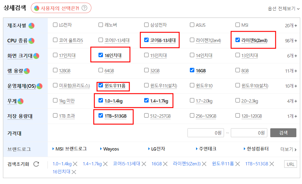 ■ 아래 노트북 스팩으로 검색한다. ☞ 다나와 바로가기(클릭!)