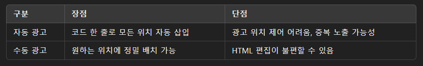 - 중간 광고: 본문 중간 부분에 HTML 수동 삽입