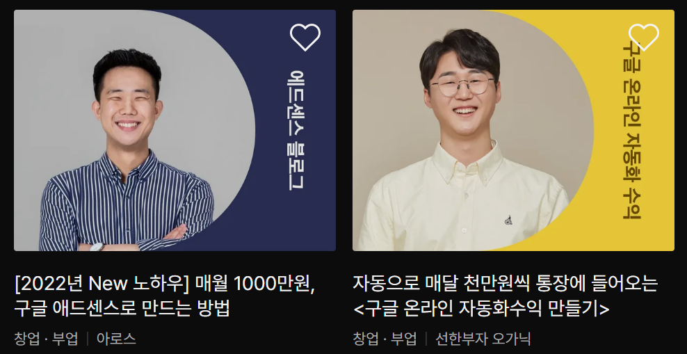 클래스101+에서 구글 애드센스로 검색하면 관련 여러 강의가 나온다. 대부분 애드센스 등을 통한 부수익으로 경제적 자유를 달성한 사람들이 직접 강의하는 방식이라 일단 신뢰가 간다. 또한 각 강의는 여러 개의 짤막한 커리큘럼으로 이루어져 있는데 진행이 깔끔하고 각종 팁, 링크 등을 포함한 수업자료도 친절하게 제공된다.