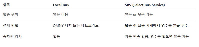- SBS는 정류장 간격이 길고 속도가 빠름 → 관광지 간 이동에 좋음