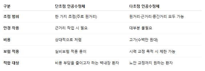 단초점 vs 다초점 인공수정체 비교표