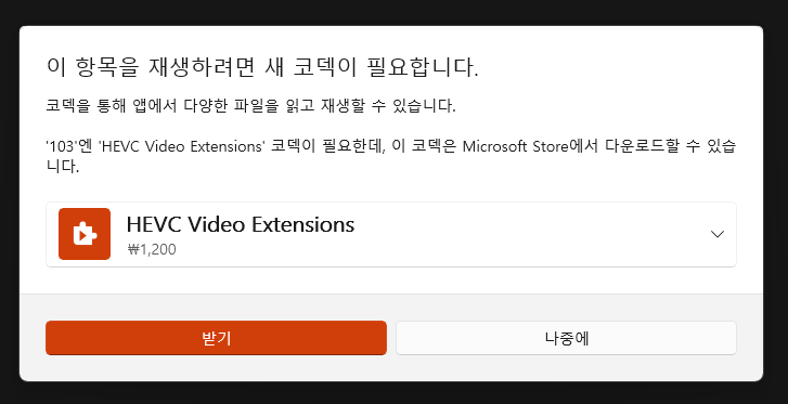 - Microsoft Store에서 제공하는 HEVC Video Extensions는 유료(약 1,100원)입니다.