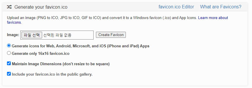 이제 다시 무료 파비콘 제작 사이트로 돌아가 '파일선택'을 클릭하여 이미지 파일을 불러온 뒤 Create Favicon을 클릭하면 된다.