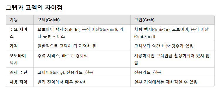 발리에서 **고젝(Gojek)**은 그랩(Grab)과 더불어 매우 유용한 앱입니다. 두 서비스는 비슷하지만, 몇 가지 차이가 있습니다. 고젝을 효과적으로 활용하는 방법과 그랩과의 차이를 아래에 정리했습니다.