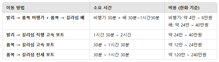 - 주요 항구: 롬복의 퍼르만 항구(Padang Bai Port) 또는 사랑안(Senggigi) 항구에서 고속 페리를 타고 길리섬으로 이동할 수 있습니다. 이 두 항구 모두 롬복 공항에서 차량으로 약 1시간에서 1시간 30분 거리에 위치하고 있습니다.