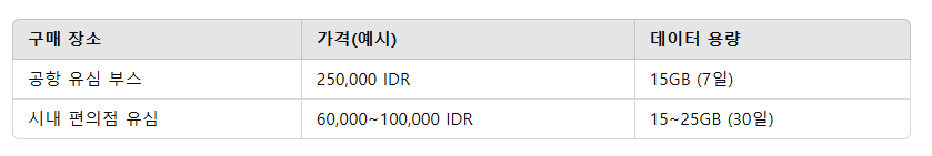 공항에서는 특정 통신사(예: XL, Indosat) 유심만 제공되는 경우가 많지만,