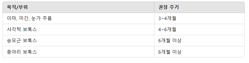 • 근육 활동성: 근육이 활발하거나 주름이 빨리 돌아오는 경우는 짧은 주기(3개월).
