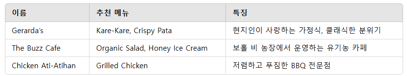 🍽️ 현지 맛집 및 카페 (Where to Eat in Tagbilaran)