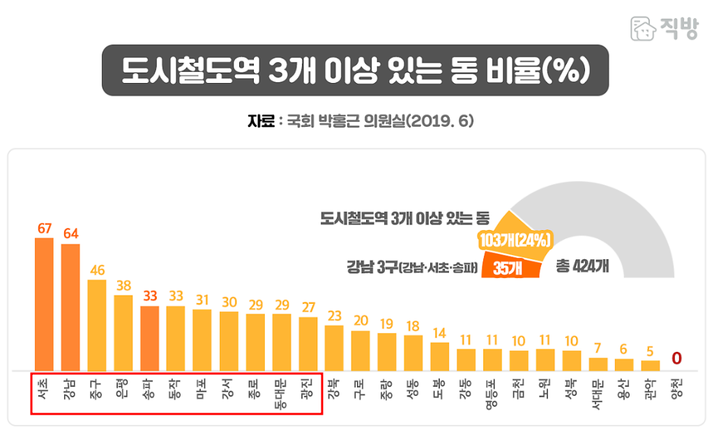 - 통근(학)시간 하위 3개구 : 동대문구33.3분, 서대문구 33.5분, 서초구 33.5분