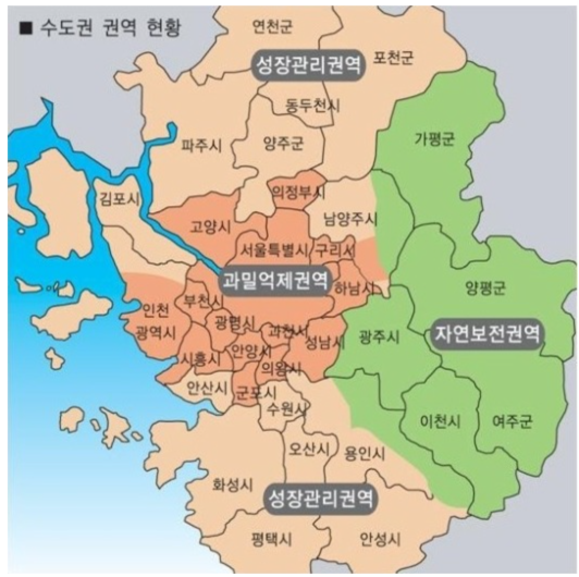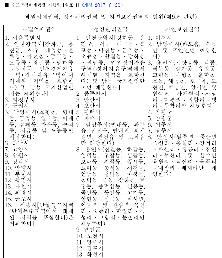 수도권의 인구와 산업을 적정하게 배치하기 위하여 수도권을 다음과 같이 구분하며 각 지역의 범위는 대통령령으로 정한다.