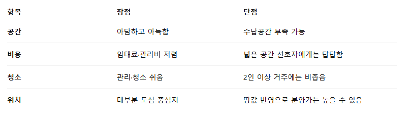 - 소형 오피스텔: 원룸 또는 1.5룸 구조, 사무 등록이지만 주거용으로 활용