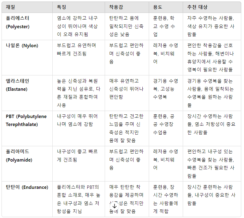 - 추천 이유: 부드럽고 신축성이 좋아 편안한 착용감을 제공하므로, 초보자가 수영을 시작할 때 적합합니다.