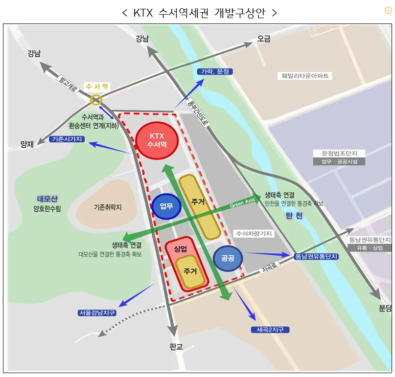 수서차량기지 일대의 그린벨트 해제와 개발에 대한 논의가 활발히 진행되고 있습니다. 서울시는 수서차량기지 부지를 입체·복합 개발하여 주거, 상업, 문화시설과 녹지 공간을 조성하는 계획을 발표한 바 있습니다.