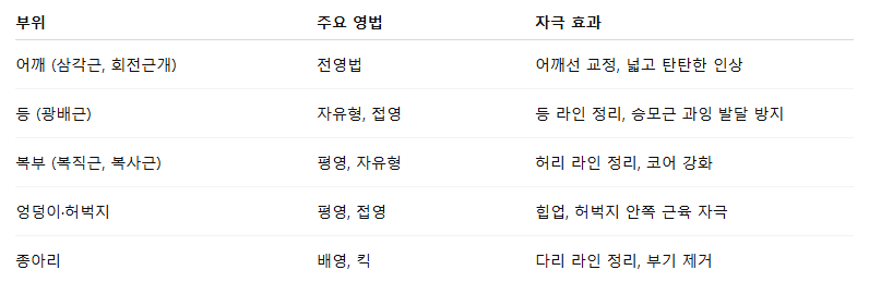 • 팔, 어깨, 다리를 동시에 써서 라인 불균형이 적음