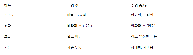 이는 **알파파(α파)**를 증가시켜 명상과 유사한 심리적 안정 효과를 유도합니다.