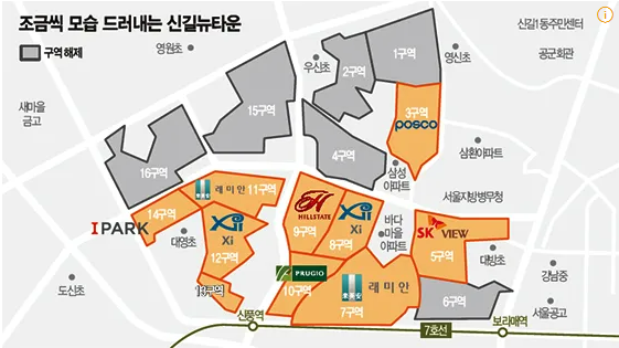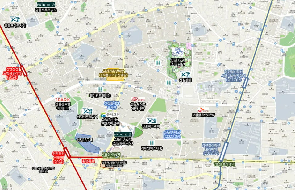 - 완료된 구역: 신길3구역, 5구역, 7구역 등에서 재개발이 완료되어 '래미안 프레비뉴', '신길센트럴자이', '래미안에스티움' 등의 대단지가 입주를 마쳤습니다.