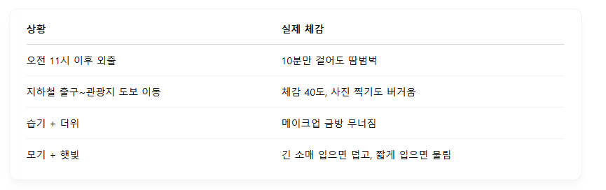 그리고 현지에서 더위를 피하는 현실적인 팁까지 정리해드립니다.