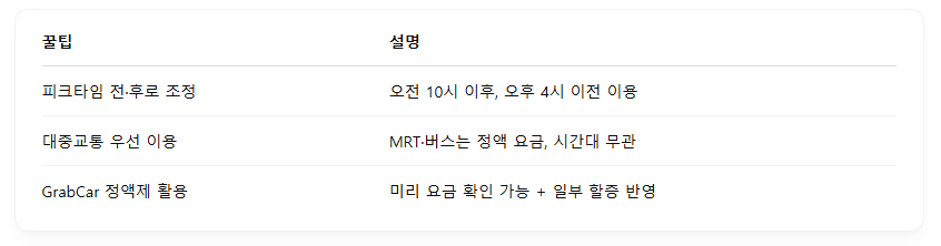 ✔ GrabTaxi는 미터 + 할증이 따로 붙으므로 요금 변동성 ↑