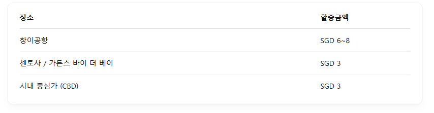 - 예: 공항에서 심야에 시내로 이동 → 기본요금 + 심야 50% + 공항 할증 SGD 8