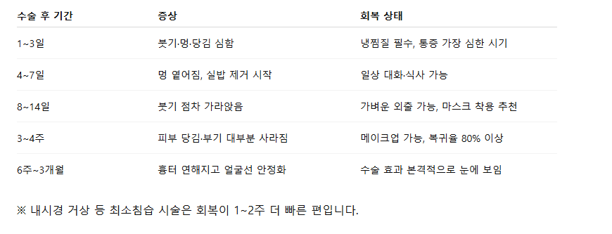 수술 종류(미니거상, 전체거상), 연령, 체질에 따라 다르지만 평균적인 회복 스케줄은 다음과 같습니다.