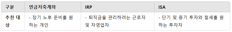 연금저축, IRP(개인형 퇴직연금), ISA(개인종합자산관리) 계좌 -> 비교분석