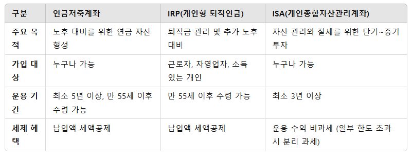 연금저축계좌, IRP(개인형 퇴직연금) 계좌, ISA(개인종합자산관리계좌)는 모두 세제 혜택을 제공하는 계좌이지만, 목적과 운영 방식에서 차이가 있습니다. 아래는 세 계좌의 차이점을 비교 분석한 내용입니다