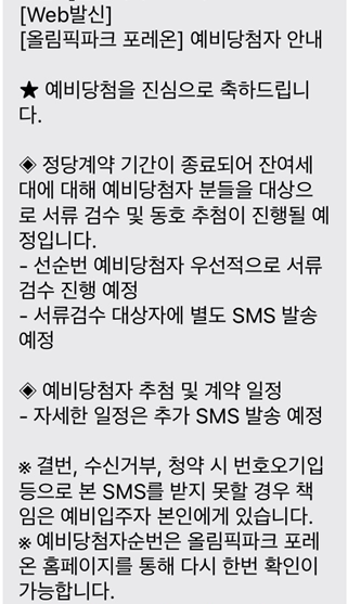■ 타입별 예비순번 안내 문자 '예비당첨자 안내' 문자는 예비순번은 2000번 이상까지 발송되었으며 , '서류제출 안내' 문자(아래)는 예비순번에 해당하는 사람에게만 발송되었음 예비순번 대상