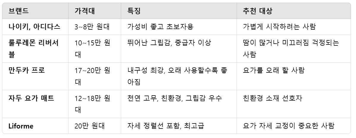 요가 매트는 두께, 소재, 그립감, 내구성 등에 따라 선택이 달라집니다. 용도에 맞는 브랜드를 추천해 드릴게요.