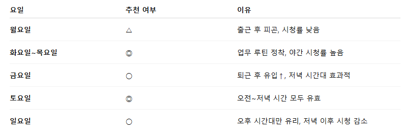 → 모바일 시청자 대상, 정보형 콘텐츠에 유리 - 오후 6시 ~ 9시 (퇴근·저녁 시간)