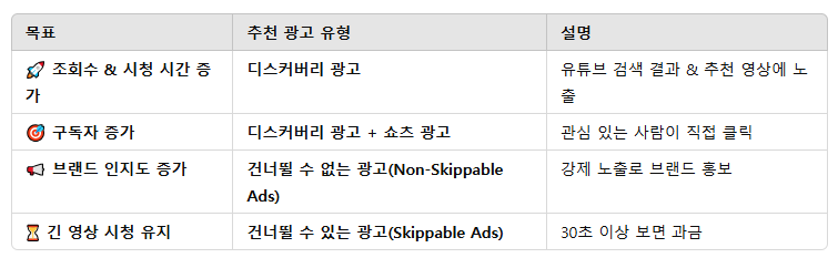 유튜브 광고는 여러 가지 유형이 있으며, 목표에 따라 적절한 광고를 선택해야 합니다.