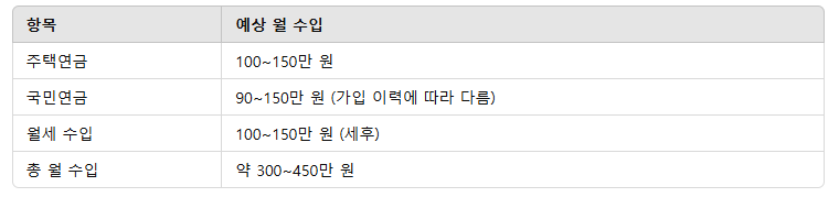 - "주택연금 + 국민연금 + 월세 수입" 조합으로 월 300~450만 원 수입 가능