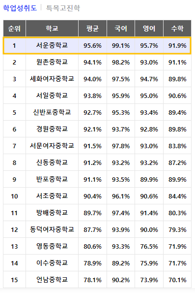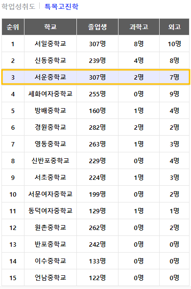 - 서초구 학군 전체에서 서일중이 특목고 진학률 top1
