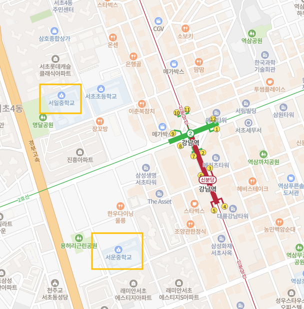 - 강남역 부근 도보권에 서일중, 서운중학교가 위치함
