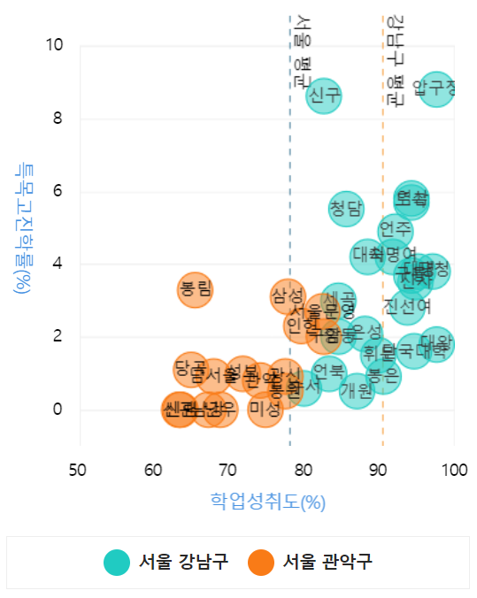 - 강남구 하위 학군의 학업 성취도가 서울 평균을 상회