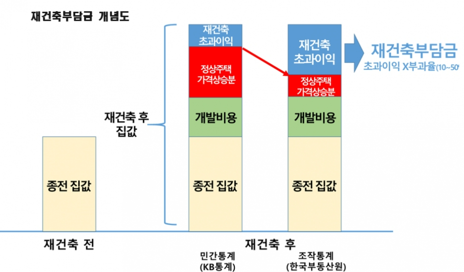 - 정부는 재건축에 따른 초과이익은 같은 지역의 아파트뿐만 아니라 단독, 연립주택에 견줘서도 발생하기 때문에 전체 집값 상승률을 기준으로 삼아야 한다고 보고 있음