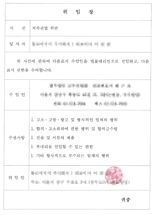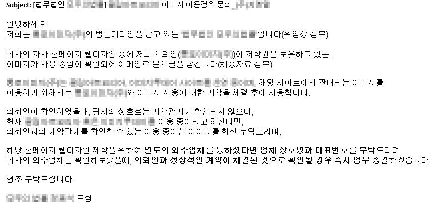 법무법인을 통해 저작권 침해 통보, 또는 특정 이미지 이용 경위에 대해 해명을 요구하는 이메일을 받는 경우가 있다. 보통 법무법인이 저작권자의 법률 대리인으로 선임되어 ‘저작권 위반’ 사건에 대한 고소, 고발, 합의금 수령 등을 진행하는 것이 일반적이다.