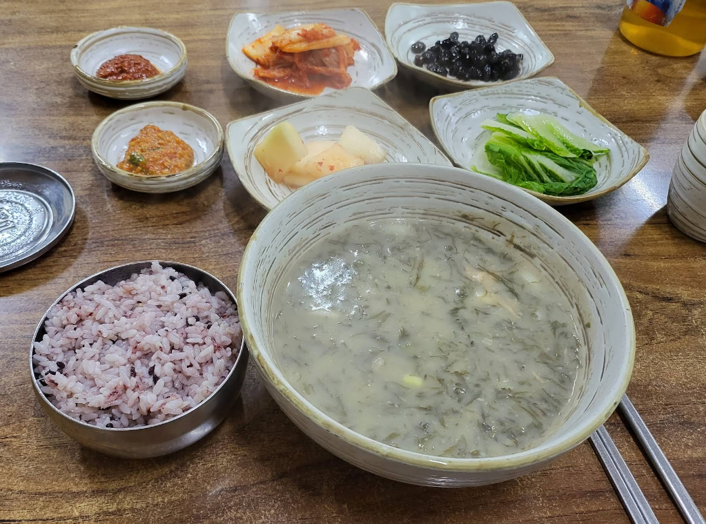 돼지뼈 육수에 모자반(해조류), 찹쌀가루를 풀어 만든 따뜻한 국입니다.