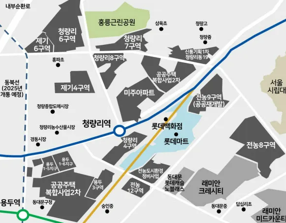 - 청량리 8구역: 사업시행인가를 준비 중이며, 청량리역 도보 이용이 가능한 위치에 있습니다.