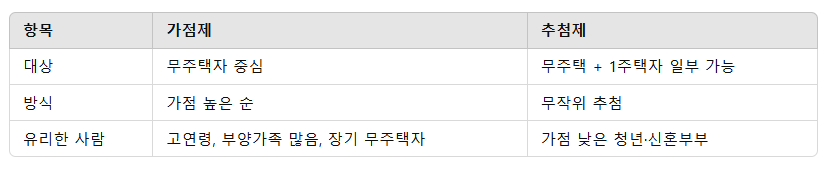 ✅ 2. 청약 가점제 vs 추첨제 비교